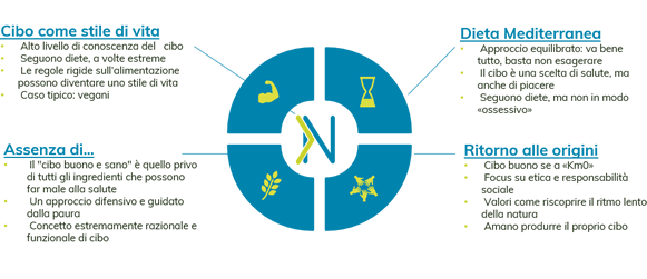 - CIBO COME STILE DI VITA: anche loro seguono un concetto razionale e funzionale, ma in modo più proattivo e propositivo. Per loro l’alimentazione è una regola e spesso le regole rigide si trasformano in uno stile di vita. Un esempio di quest’approccio è rappresentato da coloro che scelgono un’alimentazione vegana.