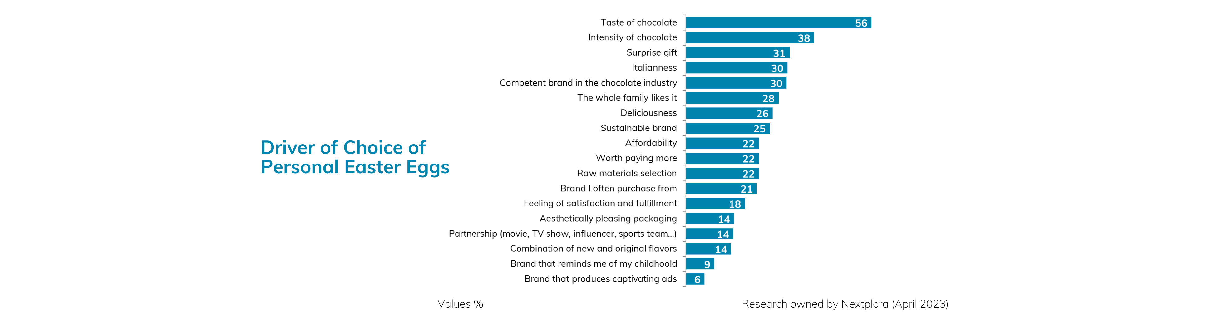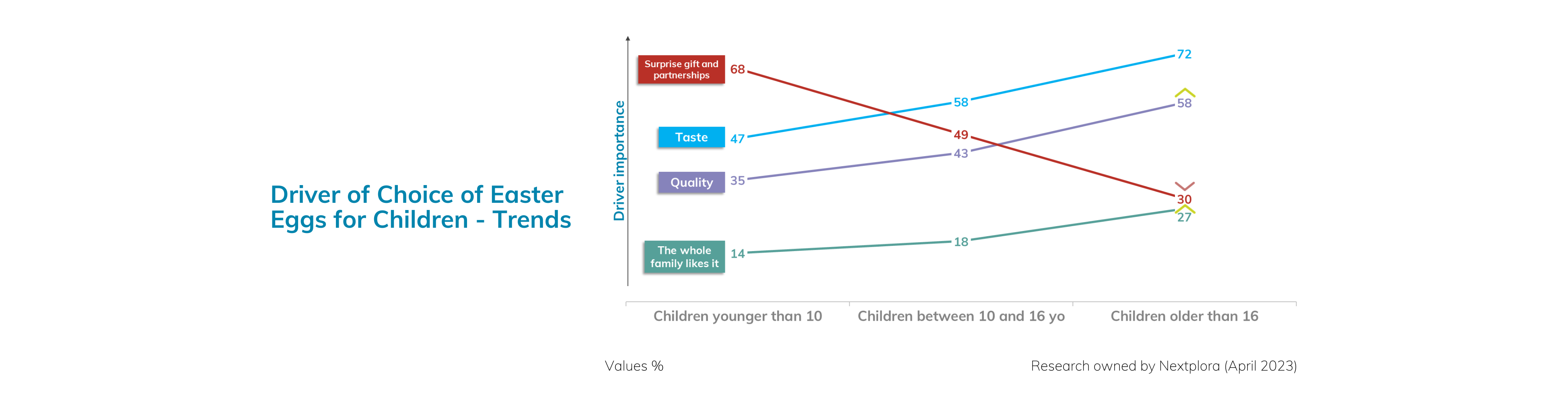 In the third and final graph, we explored how the drivers of choice varied based on the age of children in the household. We found that taste and chocolate quality became increasingly important as children grew older, while the surprise gift and partnerships became less relevant. As children enter their late teens, their taste preferences begin to converge with those of their parents, leading to greater shared enjoyment of Easter eggs within the family.