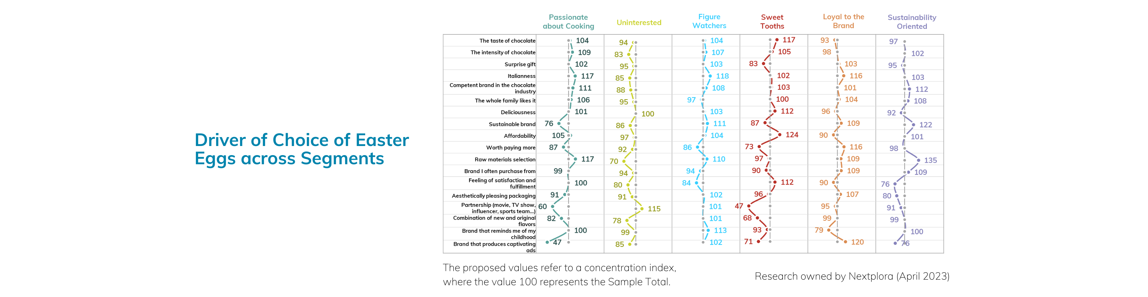In the second graph, we delved into the drivers of choice using a segmentation analysis about consumer’s attitude towards food and nutrition. We found that consumers who were “Uninterested” in food had the highest concentration index for partnerships with movies, TV shows, influencers, and sports teams. Their responses indicated a lower priority for “Intensity of chocolate” (83) and “Raw materials selection” (70).