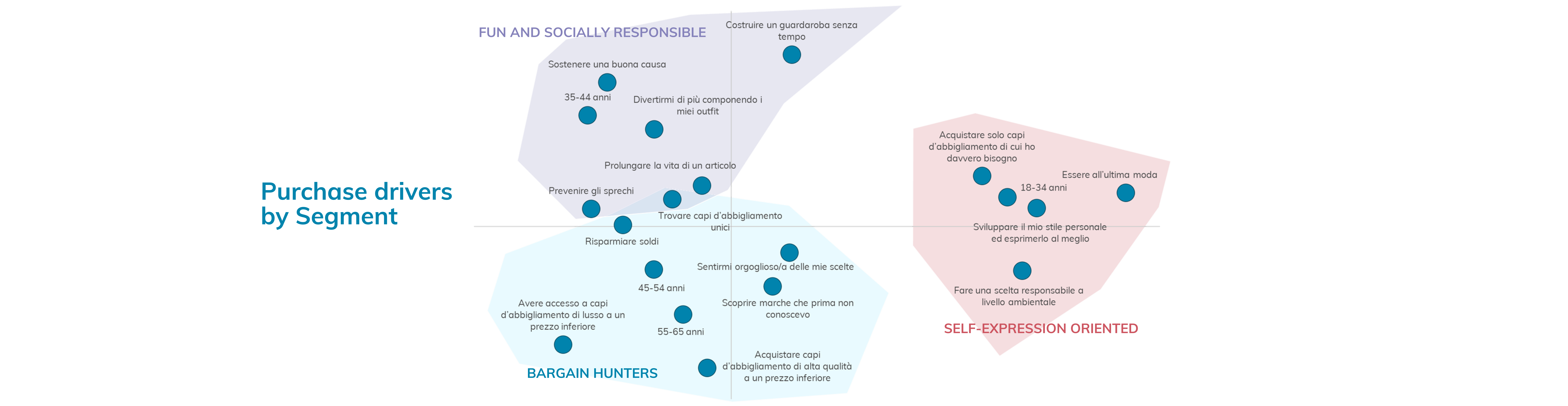 Motivations for buying second-hand clothes on online platforms vary by age group. For 18-34 year olds, expressing their personal style and making an environmentally responsible choice are key drivers. They’re passionate about self-expression and sustainability, making them the SELF-EXPRESSION ORIENTED segment. In contrast, the 35-44 year old group enjoys the process of putting together unique outfits and supporting good causes, earning them the FUN AND SOCIALLY RESPONSIBLE label. Finally, the 45-65 year old group are all about bargains and savings, with access to higher quality or luxury items at a lower price being the top priority. They’re the BARGAIN HUNTERS of the bunch.