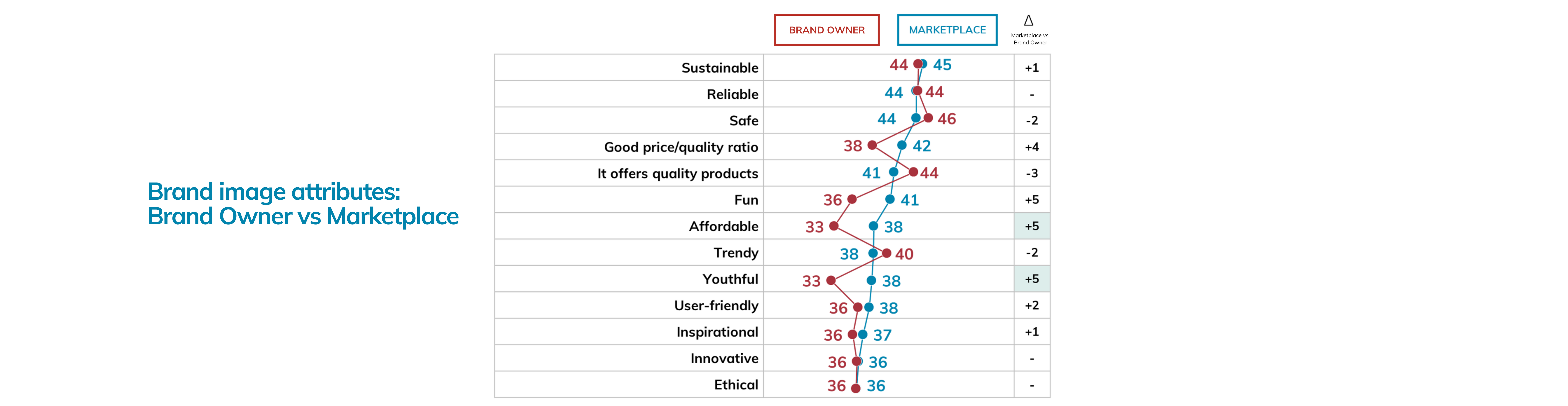Upon analyzing the image attributes of Marketplace platforms versus Brand Owner platforms, we can observe that the former are widely viewed as more Affordable, with a 5% edge, and Youthful, with a 2% edge. On the other hand, Brand Owner platforms are perceived as being somewhat more Secure than Marketplace platforms. Both types of platforms are perceived as equally Reliable, Innovative, and Ethical. Interestingly, Marketplace platforms are perceived to be of lower quality than Brand Owner platforms on average. These findings align with people’s overall perception of these platforms. Safety is becoming an increasingly serious concern for Marketplace platforms, which have historically provided less protection for consumers. The perception of lower quality on Marketplace platforms can be attributed to the fact that the seller is a third party, and there is no guarantee that the product that arrives in the mail matches the ad and does not have more damage than described in the product description.