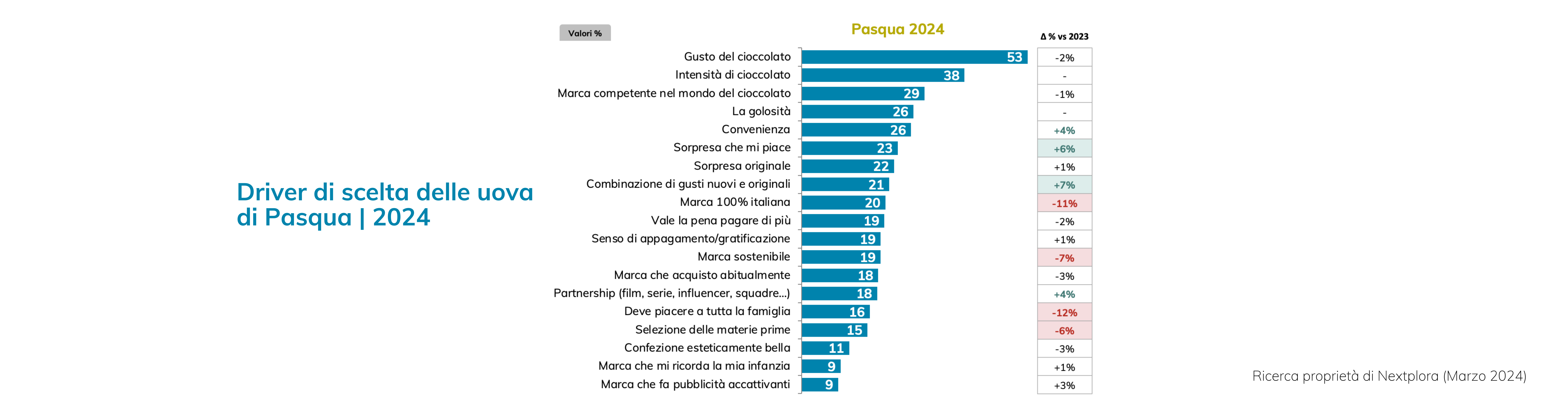 I risultati hanno rivelato che il gusto del cioccolato rimane un pilastro fondamentale, con il 53% dei partecipanti che indica la preferenza per questo attributo. Al secondo posto troviamo l’intensità del cioccolato con un 38%. Tuttavia, emergono anche altre tendenze interessanti. Ad esempio, il desiderio di provare gusti nuovi ed originali ha registrato un aumento del 7% rispetto all’anno precedente, suggerendo una crescente apertura verso l’innovazione. Allo stesso tempo, notiamo una diminuzione nell’importanza di driver come la necessità che l’uovo piaccia a tutta la famiglia (-12%), la preferenza per marche 100% italiane (-11%) e la sostenibilità della marca (-7%).