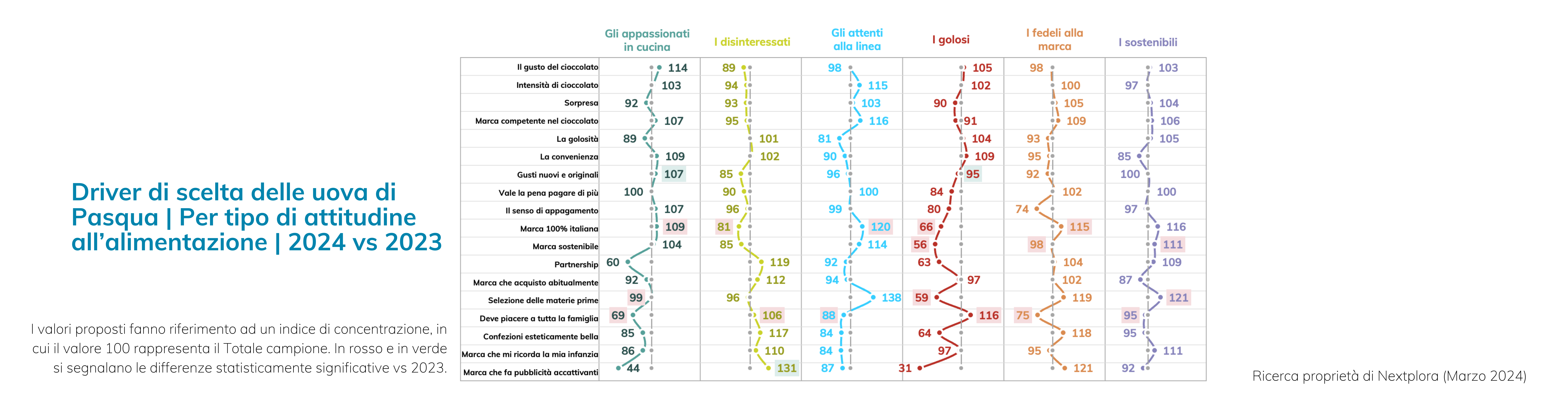 Tra gli attenti alla linea, emergono segnali di una crescente rilevanza data alla selezione delle materie prime, con un indice di concentrazione del 138. Tuttavia, mentre l’indice di concentrazione dell’italianità della marca rimane un driver importante, notiamo una leggera flessione rispetto all’anno precedente. Questo potrebbe riflettere una crescente attenzione verso la qualità degli ingredienti e una maggiore apertura verso marche non necessariamente italiane, purché rispettino gli standard desiderati.